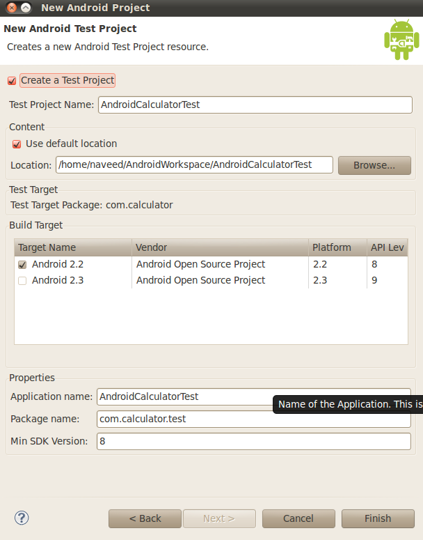 From New Android Project Window, enter Test Project Name as ‘AndroidCalculatorTestApk’, Check Android 2.2 from Build Target section, Application Name ‘AndroidCalculatorTestApk’, Package Name ‘com.testcalculator’, ‘8’ as Min SDK Version and click on Finish.