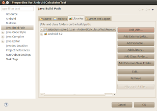 We need to reference the Robotium jar to our project. Right click on project select Build Path, and then click on Configure Build Path option. On Properties window click on Libraries tab and add Robotium jar into project.